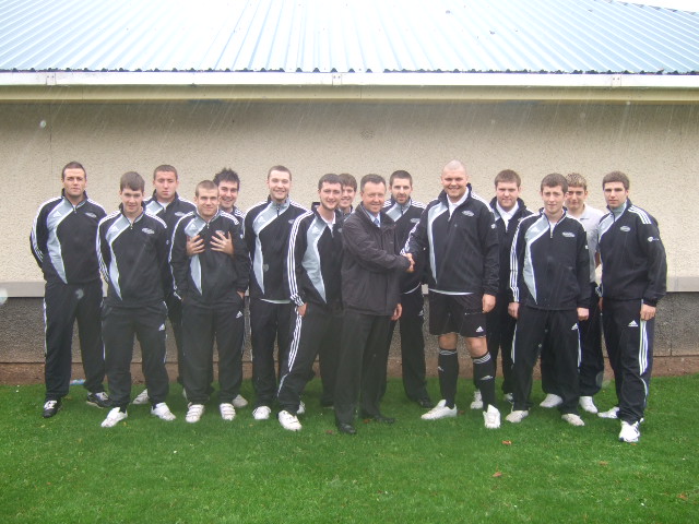 | Stewart Doyle GSK Manager presenting new tracksuits to Sean Whitworth Merpro captain |
